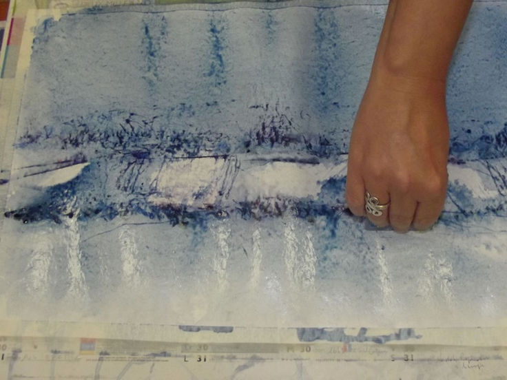« ... Ajoutons du sel, de l'alcool, du liquide vaisselle, du fiel de bœuf, des jus végétaux sur les couleurs humides et nous observerons les effets produits. Appliquons la couleur avec d'autres outils que nos pinceaux habituels, pailles, cartons, peignes à cheveux, papier bulle, éclaboussons, soufflons...